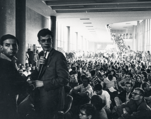Am 22. Juni 1966 besetzen rund 3.000 Studierende den Henry-Ford Bau der FU Berlin – das erste Sit-in in Deutschland. Sie protestieren gegen eine geplante Studienreform und fordern mehr Mitbestimmung. / Foto: Bernard Larsson / FU Berlin, UA, Foto-S, BL-F/011